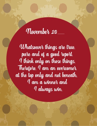 November 20 Whatsoever things are true, pure and of a good report, I think only on those things. Therefore, I am an overcomer, at the top only and not beneath. I am a winner and I always win.