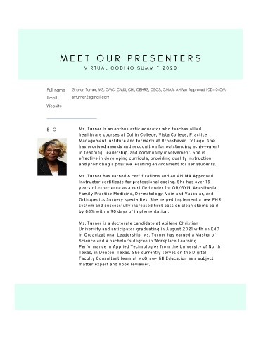 Sharon Turner, MS, CMC, CMIS, CHI, CEHRS, CBCS, CMAA, AHIMA Approved ICD-10-CM