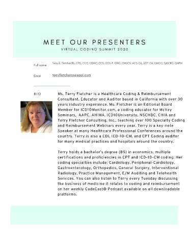 Ms. Terry Fletcher is a Healthcare Coding & Reimbursement